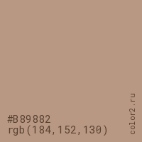 Цвет #B89882 в цветовой модели RGB обозначается тремя октетами (184, 152, 130) в десятичном формате и #B89882 в шестнадцатиричном (hex) формате, которые являются интенсивностью красного 184 (hex B8), интенсивность зелёного 152 (hex 98) и интенсивность синего 130 (hex 82).