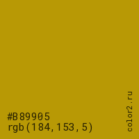 Цвет #B89905 в цветовой модели RGB обозначается тремя октетами (184, 153, 5) в десятичном формате и #B89905 в шестнадцатиричном (hex) формате, которые являются интенсивностью красного 184 (hex B8), интенсивность зелёного 153 (hex 99) и интенсивность синего 5 (hex 05).