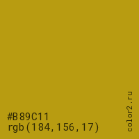 Цвет #B89C11 в цветовой модели RGB обозначается тремя октетами (184, 156, 17) в десятичном формате и #B89C11 в шестнадцатиричном (hex) формате, которые являются интенсивностью красного 184 (hex B8), интенсивность зелёного 156 (hex 9C) и интенсивность синего 17 (hex 11).
