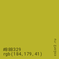 Цвет #B8B329 в цветовой модели RGB обозначается тремя октетами (184, 179, 41) в десятичном формате и #B8B329 в шестнадцатиричном (hex) формате, которые являются интенсивностью красного 184 (hex B8), интенсивность зелёного 179 (hex B3) и интенсивность синего 41 (hex 29).