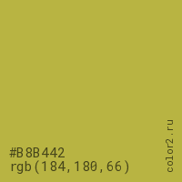Цвет #B8B442 в цветовой модели RGB обозначается тремя октетами (184, 180, 66) в десятичном формате и #B8B442 в шестнадцатиричном (hex) формате, которые являются интенсивностью красного 184 (hex B8), интенсивность зелёного 180 (hex B4) и интенсивность синего 66 (hex 42).