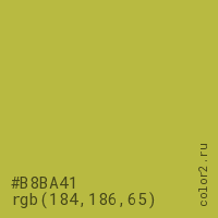 Цвет #B8BA41 в цветовой модели RGB обозначается тремя октетами (184, 186, 65) в десятичном формате и #B8BA41 в шестнадцатиричном (hex) формате, которые являются интенсивностью красного 184 (hex B8), интенсивность зелёного 186 (hex BA) и интенсивность синего 65 (hex 41).