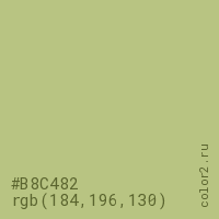 Цвет #B8C482 в цветовой модели RGB обозначается тремя октетами (184, 196, 130) в десятичном формате и #B8C482 в шестнадцатиричном (hex) формате, которые являются интенсивностью красного 184 (hex B8), интенсивность зелёного 196 (hex C4) и интенсивность синего 130 (hex 82).