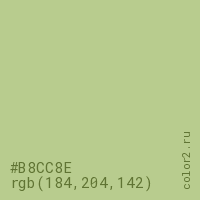 Цвет #B8CC8E в цветовой модели RGB обозначается тремя октетами (184, 204, 142) в десятичном формате и #B8CC8E в шестнадцатиричном (hex) формате, которые являются интенсивностью красного 184 (hex B8), интенсивность зелёного 204 (hex CC) и интенсивность синего 142 (hex 8E).