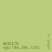Цвет #B8CE7D в цветовой модели RGB обозначается тремя октетами (184, 206, 125) в десятичном формате и #B8CE7D в шестнадцатиричном (hex) формате, которые являются интенсивностью красного 184 (hex B8), интенсивность зелёного 206 (hex CE) и интенсивность синего 125 (hex 7D).