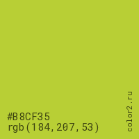 Цвет #B8CF35 в цветовой модели RGB обозначается тремя октетами (184, 207, 53) в десятичном формате и #B8CF35 в шестнадцатиричном (hex) формате, которые являются интенсивностью красного 184 (hex B8), интенсивность зелёного 207 (hex CF) и интенсивность синего 53 (hex 35).