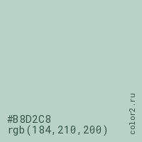 Цвет #B8D2C8 в цветовой модели RGB обозначается тремя октетами (184, 210, 200) в десятичном формате и #B8D2C8 в шестнадцатиричном (hex) формате, которые являются интенсивностью красного 184 (hex B8), интенсивность зелёного 210 (hex D2) и интенсивность синего 200 (hex C8).