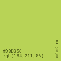 Цвет #B8D356 в цветовой модели RGB обозначается тремя октетами (184, 211, 86) в десятичном формате и #B8D356 в шестнадцатиричном (hex) формате, которые являются интенсивностью красного 184 (hex B8), интенсивность зелёного 211 (hex D3) и интенсивность синего 86 (hex 56).