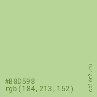 Цвет #B8D598 в цветовой модели RGB обозначается тремя октетами (184, 213, 152) в десятичном формате и #B8D598 в шестнадцатиричном (hex) формате, которые являются интенсивностью красного 184 (hex B8), интенсивность зелёного 213 (hex D5) и интенсивность синего 152 (hex 98).