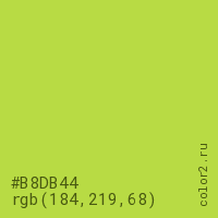 Цвет #B8DB44 в цветовой модели RGB обозначается тремя октетами (184, 219, 68) в десятичном формате и #B8DB44 в шестнадцатиричном (hex) формате, которые являются интенсивностью красного 184 (hex B8), интенсивность зелёного 219 (hex DB) и интенсивность синего 68 (hex 44).