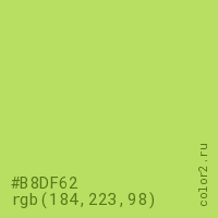 Цвет #B8DF62 в цветовой модели RGB обозначается тремя октетами (184, 223, 98) в десятичном формате и #B8DF62 в шестнадцатиричном (hex) формате, которые являются интенсивностью красного 184 (hex B8), интенсивность зелёного 223 (hex DF) и интенсивность синего 98 (hex 62).