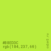 Цвет #B8ED3C в цветовой модели RGB обозначается тремя октетами (184, 237, 60) в десятичном формате и #B8ED3C в шестнадцатиричном (hex) формате, которые являются интенсивностью красного 184 (hex B8), интенсивность зелёного 237 (hex ED) и интенсивность синего 60 (hex 3C).