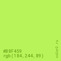 Цвет #B8F459 в цветовой модели RGB обозначается тремя октетами (184, 244, 89) в десятичном формате и #B8F459 в шестнадцатиричном (hex) формате, которые являются интенсивностью красного 184 (hex B8), интенсивность зелёного 244 (hex F4) и интенсивность синего 89 (hex 59).