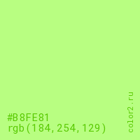 Цвет #B8FE81 в цветовой модели RGB обозначается тремя октетами (184, 254, 129) в десятичном формате и #B8FE81 в шестнадцатиричном (hex) формате, которые являются интенсивностью красного 184 (hex B8), интенсивность зелёного 254 (hex FE) и интенсивность синего 129 (hex 81).