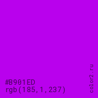 Цвет #B901ED в цветовой модели RGB обозначается тремя октетами (185, 1, 237) в десятичном формате и #B901ED в шестнадцатиричном (hex) формате, которые являются интенсивностью красного 185 (hex B9), интенсивность зелёного 1 (hex 01) и интенсивность синего 237 (hex ED).