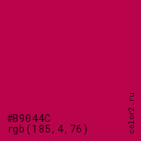 Цвет #B9044C в цветовой модели RGB обозначается тремя октетами (185, 4, 76) в десятичном формате и #B9044C в шестнадцатиричном (hex) формате, которые являются интенсивностью красного 185 (hex B9), интенсивность зелёного 4 (hex 04) и интенсивность синего 76 (hex 4C).