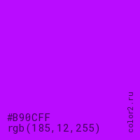 Цвет #B90CFF в цветовой модели RGB обозначается тремя октетами (185, 12, 255) в десятичном формате и #B90CFF в шестнадцатиричном (hex) формате, которые являются интенсивностью красного 185 (hex B9), интенсивность зелёного 12 (hex 0C) и интенсивность синего 255 (hex FF).