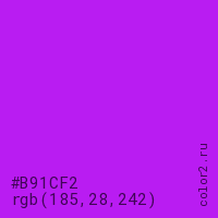 Цвет #B91CF2 в цветовой модели RGB обозначается тремя октетами (185, 28, 242) в десятичном формате и #B91CF2 в шестнадцатиричном (hex) формате, которые являются интенсивностью красного 185 (hex B9), интенсивность зелёного 28 (hex 1C) и интенсивность синего 242 (hex F2).