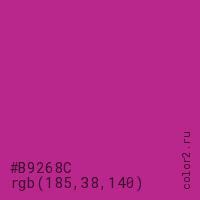 Цвет #B9268C в цветовой модели RGB обозначается тремя октетами (185, 38, 140) в десятичном формате и #B9268C в шестнадцатиричном (hex) формате, которые являются интенсивностью красного 185 (hex B9), интенсивность зелёного 38 (hex 26) и интенсивность синего 140 (hex 8C).