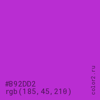 Цвет #B92DD2 в цветовой модели RGB обозначается тремя октетами (185, 45, 210) в десятичном формате и #B92DD2 в шестнадцатиричном (hex) формате, которые являются интенсивностью красного 185 (hex B9), интенсивность зелёного 45 (hex 2D) и интенсивность синего 210 (hex D2).