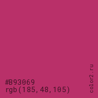 Цвет #B93069 в цветовой модели RGB обозначается тремя октетами (185, 48, 105) в десятичном формате и #B93069 в шестнадцатиричном (hex) формате, которые являются интенсивностью красного 185 (hex B9), интенсивность зелёного 48 (hex 30) и интенсивность синего 105 (hex 69).