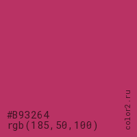 Цвет #B93264 в цветовой модели RGB обозначается тремя октетами (185, 50, 100) в десятичном формате и #B93264 в шестнадцатиричном (hex) формате, которые являются интенсивностью красного 185 (hex B9), интенсивность зелёного 50 (hex 32) и интенсивность синего 100 (hex 64).