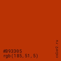 Цвет #B93305 в цветовой модели RGB обозначается тремя октетами (185, 51, 5) в десятичном формате и #B93305 в шестнадцатиричном (hex) формате, которые являются интенсивностью красного 185 (hex B9), интенсивность зелёного 51 (hex 33) и интенсивность синего 5 (hex 05).