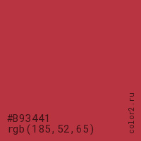 Цвет #B93441 в цветовой модели RGB обозначается тремя октетами (185, 52, 65) в десятичном формате и #B93441 в шестнадцатиричном (hex) формате, которые являются интенсивностью красного 185 (hex B9), интенсивность зелёного 52 (hex 34) и интенсивность синего 65 (hex 41).