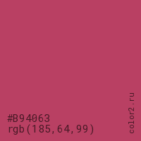 Цвет #B94063 в цветовой модели RGB обозначается тремя октетами (185, 64, 99) в десятичном формате и #B94063 в шестнадцатиричном (hex) формате, которые являются интенсивностью красного 185 (hex B9), интенсивность зелёного 64 (hex 40) и интенсивность синего 99 (hex 63).