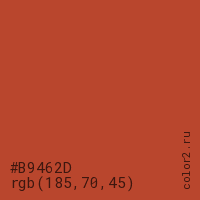 Цвет #B9462D в цветовой модели RGB обозначается тремя октетами (185, 70, 45) в десятичном формате и #B9462D в шестнадцатиричном (hex) формате, которые являются интенсивностью красного 185 (hex B9), интенсивность зелёного 70 (hex 46) и интенсивность синего 45 (hex 2D).