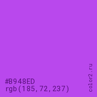 Цвет #B948ED в цветовой модели RGB обозначается тремя октетами (185, 72, 237) в десятичном формате и #B948ED в шестнадцатиричном (hex) формате, которые являются интенсивностью красного 185 (hex B9), интенсивность зелёного 72 (hex 48) и интенсивность синего 237 (hex ED).