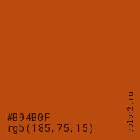 Цвет #B94B0F в цветовой модели RGB обозначается тремя октетами (185, 75, 15) в десятичном формате и #B94B0F в шестнадцатиричном (hex) формате, которые являются интенсивностью красного 185 (hex B9), интенсивность зелёного 75 (hex 4B) и интенсивность синего 15 (hex 0F).