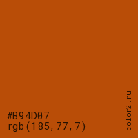 Цвет #B94D07 в цветовой модели RGB обозначается тремя октетами (185, 77, 7) в десятичном формате и #B94D07 в шестнадцатиричном (hex) формате, которые являются интенсивностью красного 185 (hex B9), интенсивность зелёного 77 (hex 4D) и интенсивность синего 7 (hex 07).