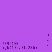 Цвет #B951EB в цветовой модели RGB обозначается тремя октетами (185, 81, 235) в десятичном формате и #B951EB в шестнадцатиричном (hex) формате, которые являются интенсивностью красного 185 (hex B9), интенсивность зелёного 81 (hex 51) и интенсивность синего 235 (hex EB).
