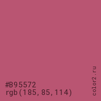 Цвет #B95572 в цветовой модели RGB обозначается тремя октетами (185, 85, 114) в десятичном формате и #B95572 в шестнадцатиричном (hex) формате, которые являются интенсивностью красного 185 (hex B9), интенсивность зелёного 85 (hex 55) и интенсивность синего 114 (hex 72).