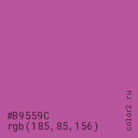 Цвет #B9559C в цветовой модели RGB обозначается тремя октетами (185, 85, 156) в десятичном формате и #B9559C в шестнадцатиричном (hex) формате, которые являются интенсивностью красного 185 (hex B9), интенсивность зелёного 85 (hex 55) и интенсивность синего 156 (hex 9C).