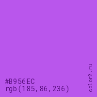 Цвет #B956EC в цветовой модели RGB обозначается тремя октетами (185, 86, 236) в десятичном формате и #B956EC в шестнадцатиричном (hex) формате, которые являются интенсивностью красного 185 (hex B9), интенсивность зелёного 86 (hex 56) и интенсивность синего 236 (hex EC).