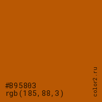 Цвет #B95803 в цветовой модели RGB обозначается тремя октетами (185, 88, 3) в десятичном формате и #B95803 в шестнадцатиричном (hex) формате, которые являются интенсивностью красного 185 (hex B9), интенсивность зелёного 88 (hex 58) и интенсивность синего 3 (hex 03).