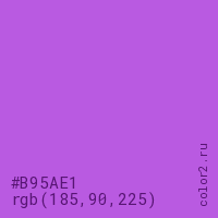 Цвет #B95AE1 в цветовой модели RGB обозначается тремя октетами (185, 90, 225) в десятичном формате и #B95AE1 в шестнадцатиричном (hex) формате, которые являются интенсивностью красного 185 (hex B9), интенсивность зелёного 90 (hex 5A) и интенсивность синего 225 (hex E1).