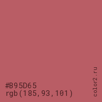 Цвет #B95D65 в цветовой модели RGB обозначается тремя октетами (185, 93, 101) в десятичном формате и #B95D65 в шестнадцатиричном (hex) формате, которые являются интенсивностью красного 185 (hex B9), интенсивность зелёного 93 (hex 5D) и интенсивность синего 101 (hex 65).