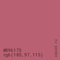 Цвет #B96173 в цветовой модели RGB обозначается тремя октетами (185, 97, 115) в десятичном формате и #B96173 в шестнадцатиричном (hex) формате, которые являются интенсивностью красного 185 (hex B9), интенсивность зелёного 97 (hex 61) и интенсивность синего 115 (hex 73).