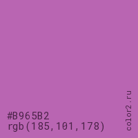 Цвет #B965B2 в цветовой модели RGB обозначается тремя октетами (185, 101, 178) в десятичном формате и #B965B2 в шестнадцатиричном (hex) формате, которые являются интенсивностью красного 185 (hex B9), интенсивность зелёного 101 (hex 65) и интенсивность синего 178 (hex B2).