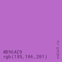 Цвет #B96AC9 в цветовой модели RGB обозначается тремя октетами (185, 106, 201) в десятичном формате и #B96AC9 в шестнадцатиричном (hex) формате, которые являются интенсивностью красного 185 (hex B9), интенсивность зелёного 106 (hex 6A) и интенсивность синего 201 (hex C9).
