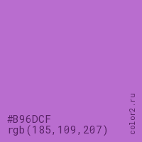 Цвет #B96DCF в цветовой модели RGB обозначается тремя октетами (185, 109, 207) в десятичном формате и #B96DCF в шестнадцатиричном (hex) формате, которые являются интенсивностью красного 185 (hex B9), интенсивность зелёного 109 (hex 6D) и интенсивность синего 207 (hex CF).