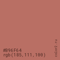 Цвет #B96F64 в цветовой модели RGB обозначается тремя октетами (185, 111, 100) в десятичном формате и #B96F64 в шестнадцатиричном (hex) формате, которые являются интенсивностью красного 185 (hex B9), интенсивность зелёного 111 (hex 6F) и интенсивность синего 100 (hex 64).
