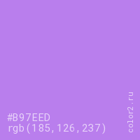 Цвет #B97EED в цветовой модели RGB обозначается тремя октетами (185, 126, 237) в десятичном формате и #B97EED в шестнадцатиричном (hex) формате, которые являются интенсивностью красного 185 (hex B9), интенсивность зелёного 126 (hex 7E) и интенсивность синего 237 (hex ED).