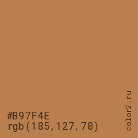 Цвет #B97F4E в цветовой модели RGB обозначается тремя октетами (185, 127, 78) в десятичном формате и #B97F4E в шестнадцатиричном (hex) формате, которые являются интенсивностью красного 185 (hex B9), интенсивность зелёного 127 (hex 7F) и интенсивность синего 78 (hex 4E).