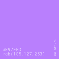 Цвет #B97FFD в цветовой модели RGB обозначается тремя октетами (185, 127, 253) в десятичном формате и #B97FFD в шестнадцатиричном (hex) формате, которые являются интенсивностью красного 185 (hex B9), интенсивность зелёного 127 (hex 7F) и интенсивность синего 253 (hex FD).