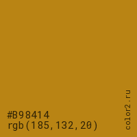 Цвет #B98414 в цветовой модели RGB обозначается тремя октетами (185, 132, 20) в десятичном формате и #B98414 в шестнадцатиричном (hex) формате, которые являются интенсивностью красного 185 (hex B9), интенсивность зелёного 132 (hex 84) и интенсивность синего 20 (hex 14).