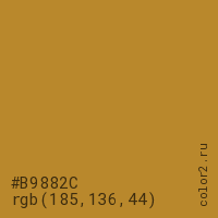 Цвет #B9882C в цветовой модели RGB обозначается тремя октетами (185, 136, 44) в десятичном формате и #B9882C в шестнадцатиричном (hex) формате, которые являются интенсивностью красного 185 (hex B9), интенсивность зелёного 136 (hex 88) и интенсивность синего 44 (hex 2C).